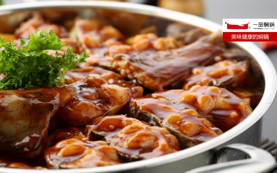 一品焖锅的浓汁焖锅底油采用秘制香油、植物色拉油加上30 余中草药,通过精密控制火候长达12小时精炼而成,通过食材与 食材、药材与药材之间的配比,将传统药膳的滋补理论与现代饮 食相结合。餐厅用餐时由服务员现场烹制的精致美食,先在锅底 放一层油,然后放一层葱、姜、蒜、洋葱,再放上一层切好的鸡 肉,最上面放上美味的酱汁,整个焖制过程不加一滴水,完全用 蔬菜的水份加上酱汁的美味一焖到底,中途不揭盖、不翻炒,肉、 菜、佐料等不受空气干扰,营养不会流失,完全补充人体所需的 维生素及蛋白质,成为健康、美味的时尚食品。