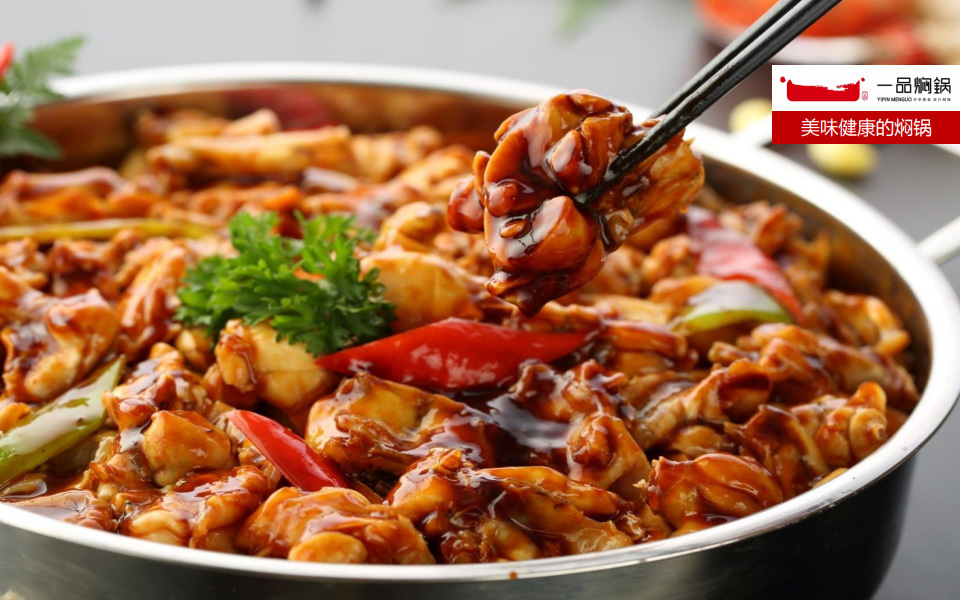 一品焖锅的浓汁焖锅底油采用秘制香油、植物色拉油加上30 余中草药,通过精密控制火候长达12小时精炼而成,通过食材与 食材、药材与药材之间的配比,将传统药膳的滋补理论与现代饮 食相结合。餐厅用餐时由服务员现场烹制的精致美食,先在锅底 放一层油,然后放一层葱、姜、蒜、洋葱,再放上一层切好的鸡 肉,最上面放上美味的酱汁,整个焖制过程不加一滴水,完全用 蔬菜的水份加上酱汁的美味一焖到底,中途不揭盖、不翻炒,肉、 菜、佐料等不受空气干扰,营养不会流失,完全补充人体所需的 维生素及蛋白质,成为健康、美味的时尚食品。